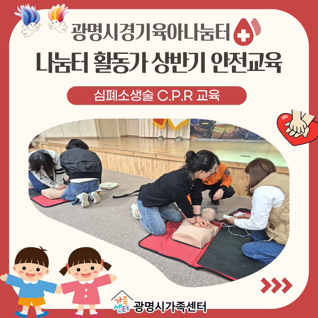 ±¤¸í½Ã°¡Á·¼¾ÅÍ °æ±âÀ°¾Æ³ª´®ÅÍ¿¡¼´Â Ȱµ¿°¡¸¦ ´ë»óÀ¸·Î ½ÉÆó¼Ò»ý¼ú(CPR) ¹× ÀÀ±Þ»óȲ ´ëÀÀ ±³À°À» ½Ç½ÃÇÏ¿´½À´Ï´Ù.À̹ø ±³À°Àº ½Ç½À Áß½ÉÀ¸·Î ÁøÇàµÇ¾î ÀÀ±Þ»óȲ ¹ß»ý ½Ã ½Å¼ÓÇϰí ÀûÀýÇÏ°Ô ´ëÀÀÇÒ ¼ö ÀÖ´Â ¿ª·®À»..