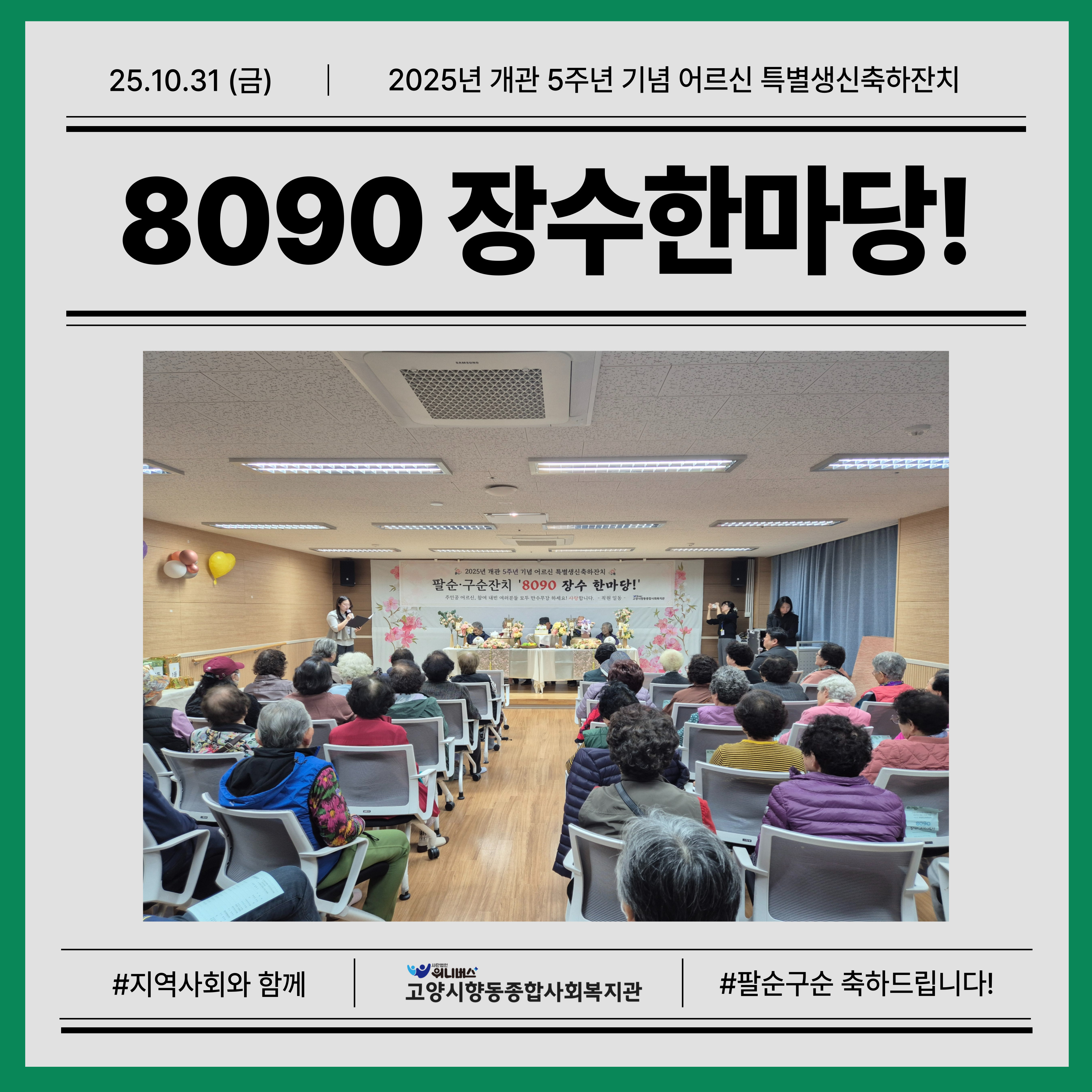 °í¾ç½ÃÇ⵿Á¾ÇÕ»çȸº¹Áö°üÀº 2025³â °³°ü 5ÁÖ³âÀ» ¸ÂÀÌÇÏ¿© ¾î¸£½Å Ưº°»ý½ÅÃàÇÏÀÜÄ¡ '8090 Àå¼öÇѸ¶´ç!'À» ÁøÇàÇÏ¿´½À´Ï´Ù. ¾à 150¿©¸íÀÇ Áö¿ªÁֹΰú ÇÔ²²ÇÑ Àå¼öÀÜÄ¡ÀÇ ¶ß°Å¿î ÇöÀåÀ» °øÀ¯µå¸³´Ï´Ù ¢¾