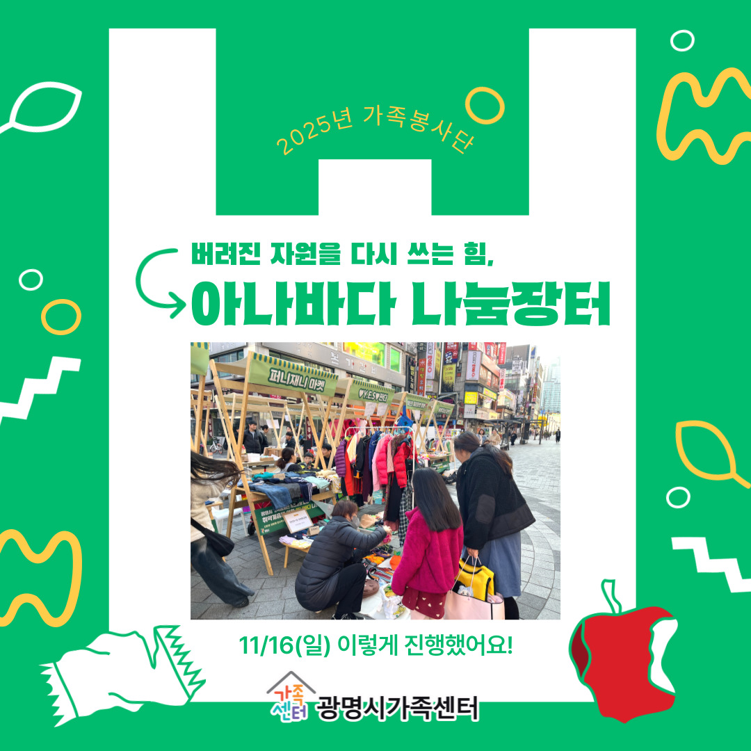 Áö³ 11¿ù 16ÀÏ(ÀÏ) ±¤¸í½Ã°¡Á·¼¾ÅÍ °¡Á·ºÀ»ç´ÜÀº ¸¦ ¿î¿µÇß½À´Ï´Ù.ȯ°æ¿À¿°ÀÇ ½É°¢¼º°ú ÀÚ¿ø¼øÈ¯ÀÇ Á߿伺ÀÌ ³ô¾ÆÁø ¿äÁò ½Ã´ë, ±¤¸í½Ã °¡Á·ºÀ»ç´ÜÀº "¾Æ³ª¹Ù´Ù ¿îµ¿"¿¡ Âü¿©Çϸç Áö¿ª»çȸ ³» ȯ°æ»ì¸®±â¿Í ³ª´®¹®..