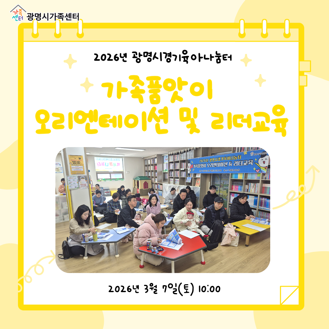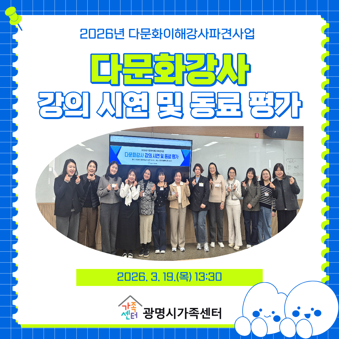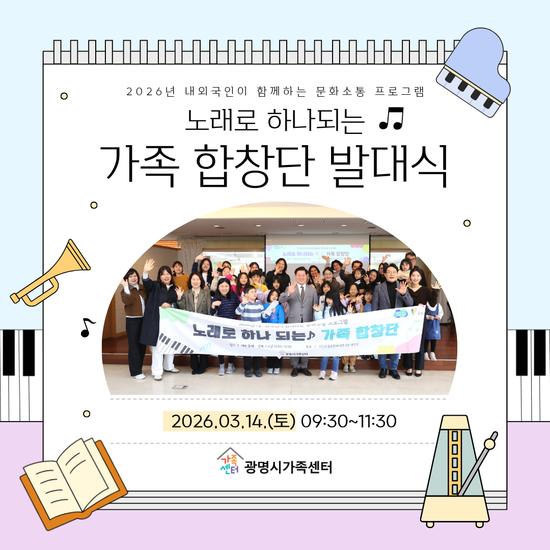 2026³â ³»¿Ü±¹ÀÎÀÌ ÇÔ²²ÇÏ´Â ¹®È¼ÒÅë ÇÁ·Î±×·¥ ' °¡Á·ÇÕâ´Ü'ÀÌ Áö³ 3/14(Åä) ¹ß´ë½ÄÀ» °¡Á³½À´Ï´Ù.À۳⿡ À̾î 2±â ´Ü¿øµéÀ» ¸ðÁýÇÑ ±¤¸í½Ã°¡Á·¼¾ÅÍ ÇÕâ´ÜÀÇ ¾ÕÀ¸·ÎÀÇ È°µ¿¿¡ ¸¹Àº °ü½É ºÎʵ叮°Ú½À´Ï´Ù.