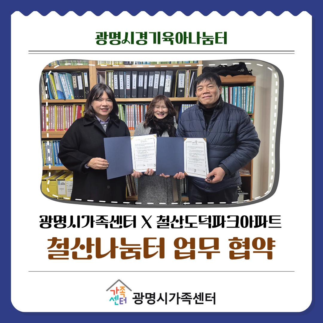±¤¸í½Ã °¡Á·¼¾ÅÍ´Â Áö¿ª»çȸ ³» µ¹º½°ú °øµ¿À°¾Æ ³ª´® ¹®È È®»êÀ» À§ÇØ Ã¶»êµµ´öÆÄÅ©¾ÆÆÄÆ®¿Í ¾÷¹«Çù¾àÀ» ü°áÇÏ¿´½À´Ï´Ù.À̹ø ¾÷¹«Çù¾àÀº »óÈ£ º¸À¯Çϰí ÀÖ´Â ÀÎÀû¡¤¹°Àû ÀÚ¿øÀÇ ±³·ù¿Í Çù·ÂÀ» ¹ÙÅÁÀ¸·Î, ³ª´®ÅÍ ..
