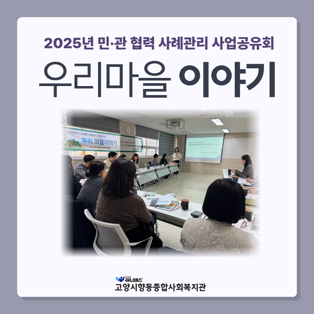 °í¾ç½ÃÇ⵿Á¾ÇÕ»çȸº¹Áö°ü¿¡¼´Â 2025³â ÇÑÇØµ¿¾È »ç·Ê°ü¸® ´ç»çÀÚ °³ÀÔÀ» À§ÇØ ¹Î°ú °üÀÌ Çù·Â »ç·Ê¸¦ °øÀ¯Çϰí ÇÔ²² ³íÀÇ, ¿ÜºÎÀü¹®°¡ ½´ÆÛºñÀüÀ» ¹Þ´Â »ç·Ê°ü¸®»ç¾÷°øÀ¯È¸¸¦ ÁøÇàÇß½À´Ï´Ù.