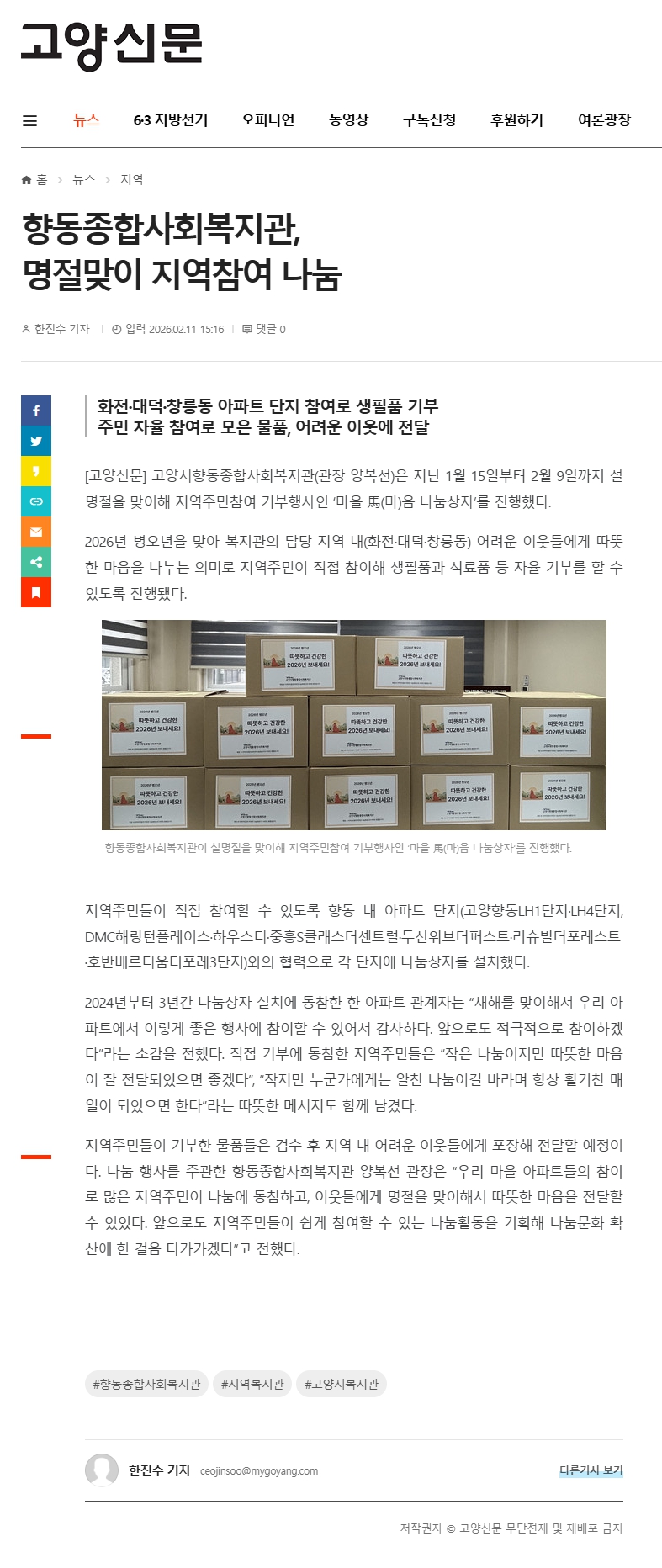 °í¾ç½ÃÇ⵿Á¾ÇÕ»çȸº¹Áö°ü¿¡¼´Â ¼³¸ÂÀÌ Áö¿ªÁÖ¹ÎÂü¿© ³ª´®Çà»ç '¸¶À»¸¶À½ ³ª´®»óÀÚ'¸¦ ÁøÇàÇß½À´Ï´Ù.