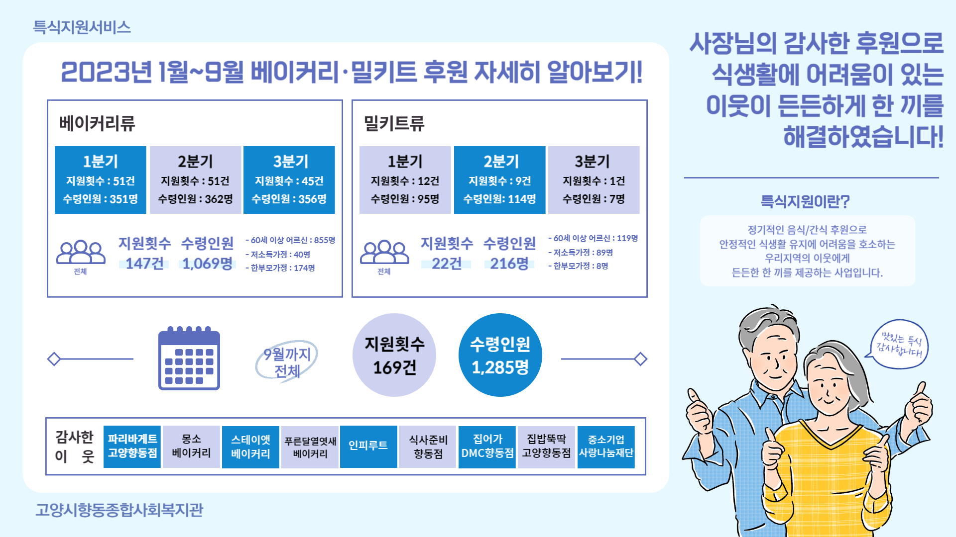 °í¾ç½ÃÇ⵿Á¾ÇÕ»çȸº¹Áö°ü¿¡¼´Â Áö¿ª ³» Ư½Ä ÈÄ¿ø¾÷ü¿Í ÇÔ²² 1¿ùºÎÅÍ 9¿ù±îÁö Ư½ÄÁö¿ø¼ºñ½º¸¦ ÁøÇàÇÏ¿´½À´Ï´Ù.