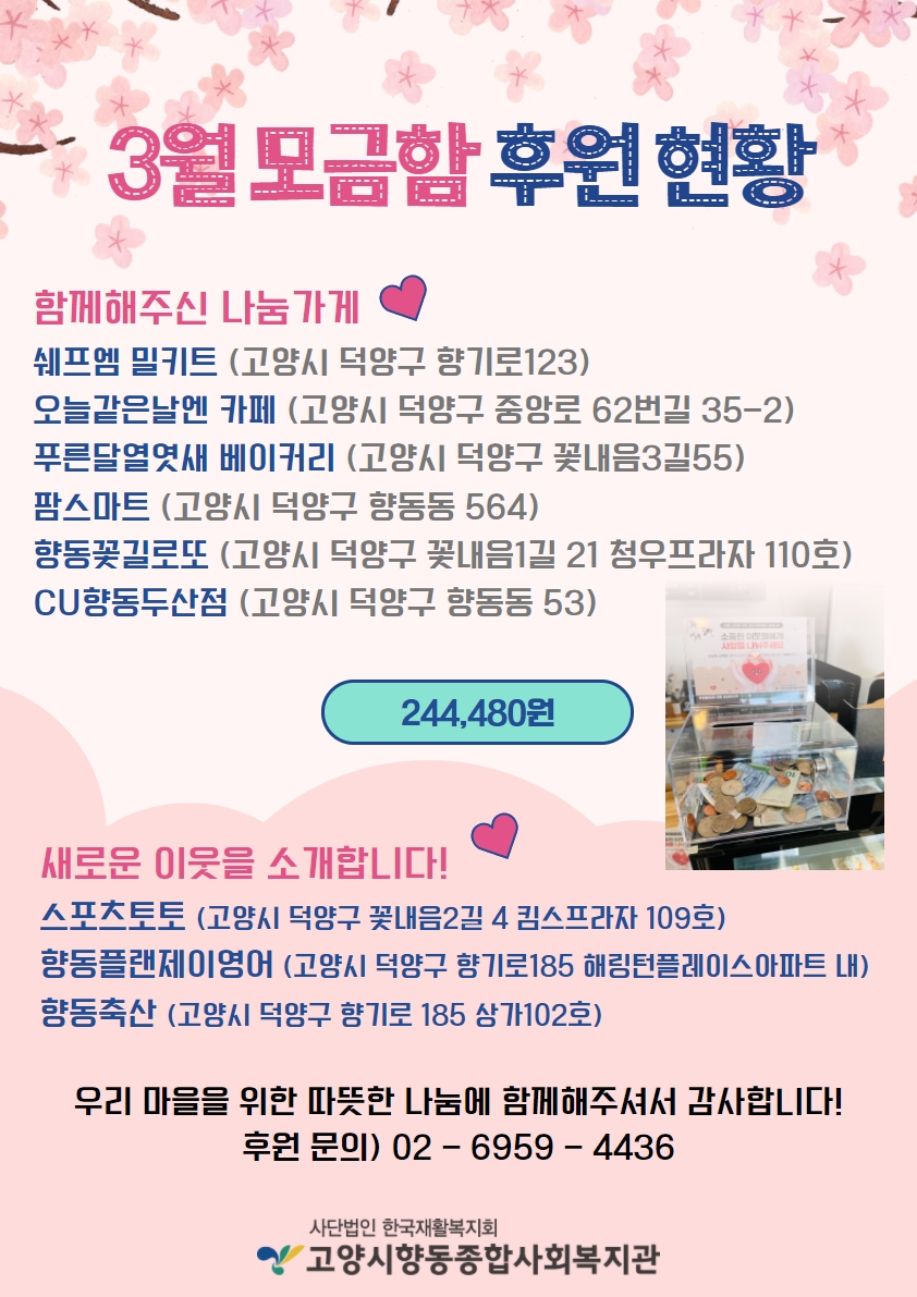3¿ù¿¡´Â 6°³ÀÇ ¸ð±ÝÇÔ ¾÷ü¸¦ ÅëÇØ ¼ÒÁßÇÑ ÈÄ¿ø±Ý 244,480¿øÀÌ ¸ð¿´½À´Ï´Ù. ¶ÇÇÑ 2°³ÀÇ ¾÷ü¿¡¼ ¸ð±ÝÇÔ ¼³Ä¡, 1°³ÀÇ ¾÷ü¿¡¼ ¿ù Á¤±â ÈÄ¿øÀ» ¾à¼ÓÇØÁּ̽À´Ï´Ù.µû¶æÇÑ ³ª´®¿¡ µ¿ÂüÇØÁּż °¨»çÇÕ´Ï´Ù.