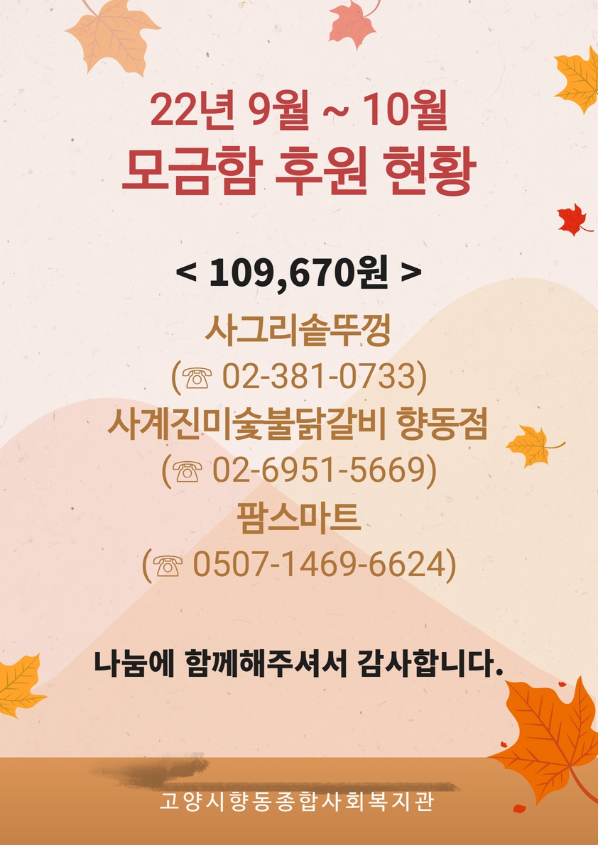 [°í¾ç½ÃÇ⵿Á¾ÇÕ»çȸº¹Áö°ü] 9¿ù~10¿ù ¸ð±ÝÇÔ ÇöȲ