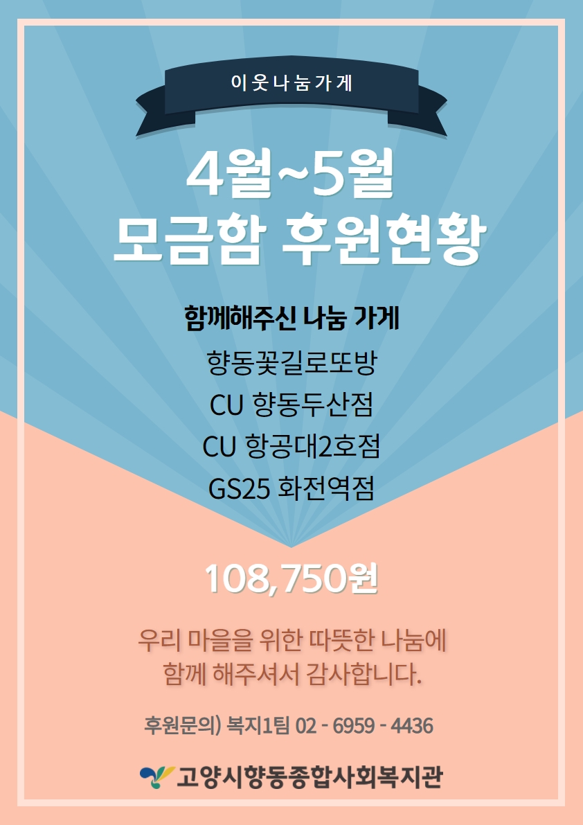 4 °÷ÀÇ ÀÌ¿ô ³ª´®°¡°Ô¿¡¼ ¸ð±ÝÇÔ ÈÄ¿ø¿¡ µ¿ÂüÇØÁּ̽À´Ï´Ù. ³ª´®°¡°Ô ¸ð±ÝÇÔÀ» ÅëÇØ ¸ðÀÎ ÈÄ¿ø±ÝÀº Áö¿ª ³» Àú¼Òµæ Ãë¾à°èÃþ, ±ä±ÞÁö¿øÀÌ ÇÊ¿äÇÑ ÀÌ¿ôÀ» À§ÇØ ¾²¿©Áý´Ï´Ù.