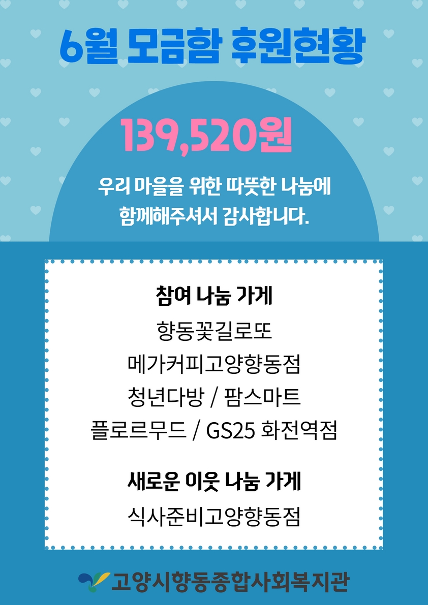 [°í¾ç½ÃÇ⵿Á¾ÇÕ»çȸº¹Áö°ü] 6¿ù ¸ð±ÝÇÔ ÈÄ¿ø ÇöȲ