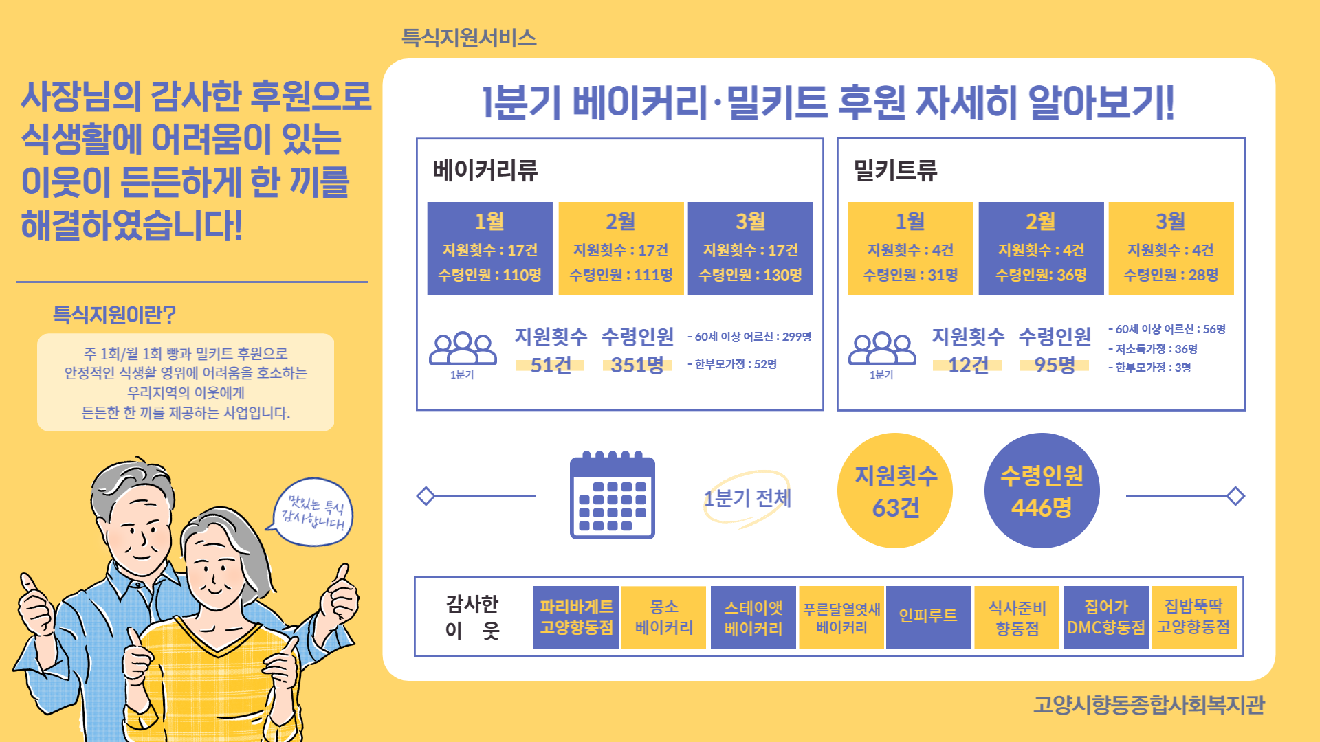 °í¾ç½ÃÇ⵿Á¾ÇÕ»çȸº¹Áö°ü¿¡¼´Â Áö¿ª ³» Ư½ÄÈÄ¿ø¾÷ü¿Í ÇÔ²² 2023³â 1ºÐ±â Ư½ÄÁö¿ø¼ºñ½º¸¦ ÁøÇàÇÏ¿´½À´Ï´Ù.